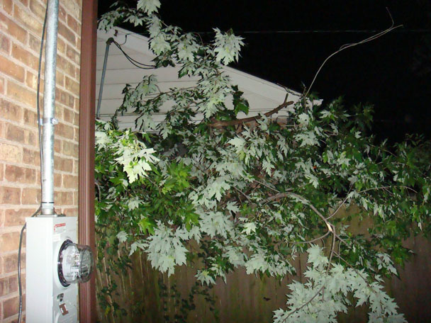 It fell from the top of the tree, hit the roof, rolled off, and landed on the fence. It narrowly missed the power lines, from both our house and the neighbors. It landed right in the middle.