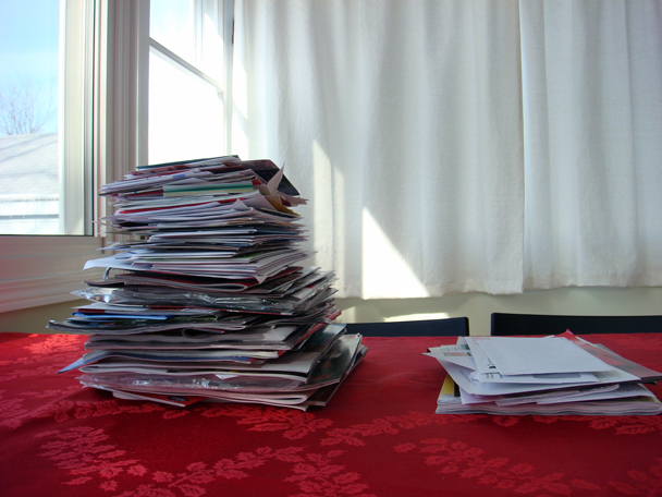 On the left side of the picture – this was our junk mail in a typical week, before the Green Dimes service kicked in. One week of mail, measuring a foot tall. One week of catalogs we’d never ordered from, like Topdeq office furniture, or Wine Country Gift baskets, or Hickory Farms, or thirty-seven Pottery Barn catalogs and twenty-six Garnet Hill catalogs. One week out of 52 of the year where we were contributing heavily to the destruction of the forests.