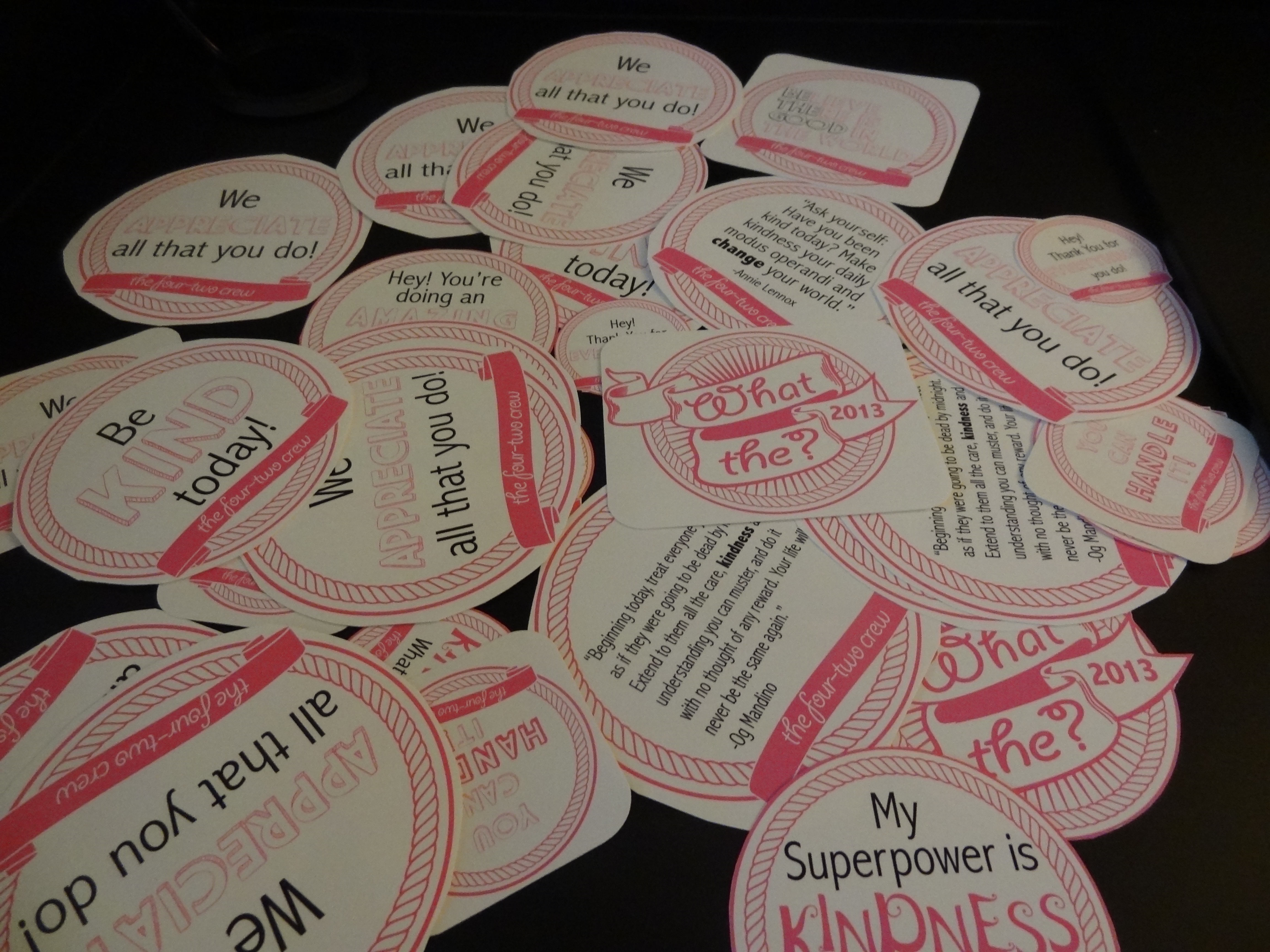 I’m teaching myself Adobe Illustrator, and as I take the train to and from work, I have about 90 minutes a day to learn new things. In the weeks leading up to our weekend, I created materials that we could use, although a graphic designer I am not. I called our mission “What The?” for two reasons. First, that’s an inside joke, one of my friend’s daughters said that out of nowhere and it cracked us up. Second, I figured it would be the response we’d get from the people who would receive these random kindnesses.